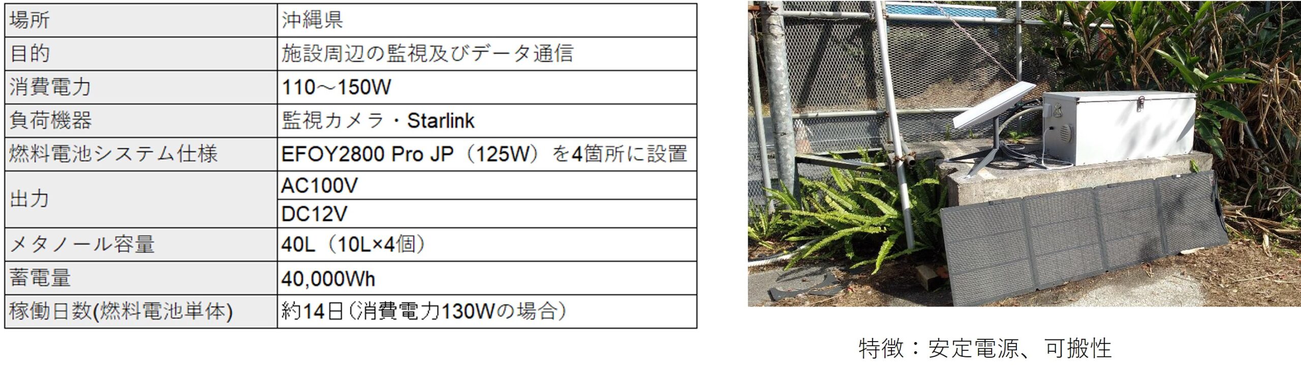 燃料電池と太陽光パネルを設置し連携することで、天候・時間帯を問わず通年での監視通信が可能となった。