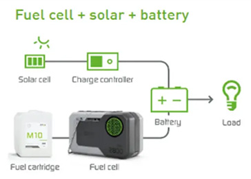 太陽光との併用も可能で、晴れの日は太陽光から、夜間・雨・曇り・雪の日は直接メタノール型燃料電池から電源供給することで、より効率よく安定した電力供給が実現します。