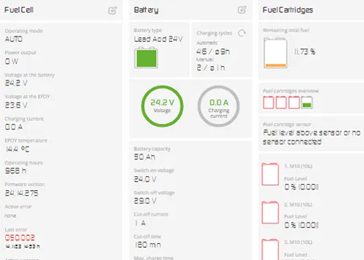 燃料であるメタノールの残量、バッテリー電圧/電流値、燃料電池のエラー情報は専用のクラウドを通して遠隔監視が可能です。